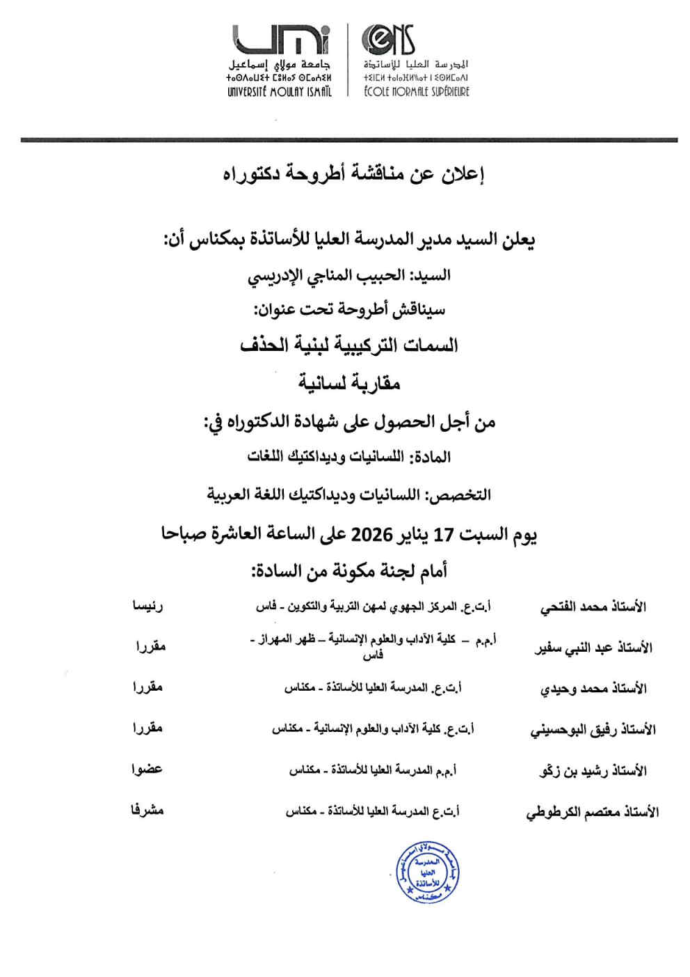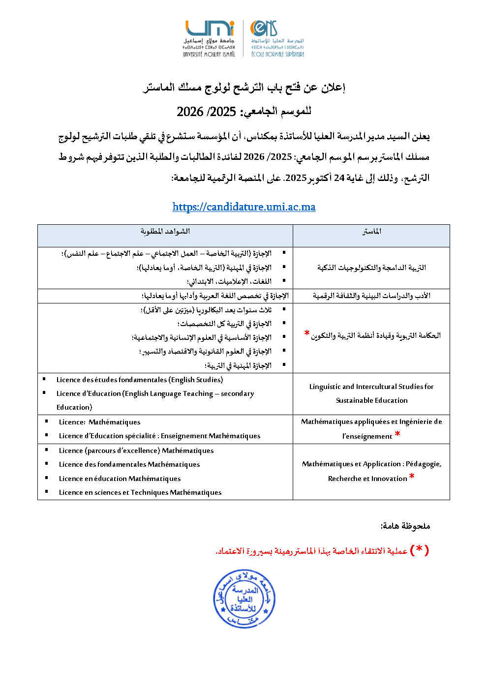J’éprouve un immense plaisir de souhaiter la bienvenue aux élèves, nouveaux étudiants, qui rejoignent l’École Normale Supérieure de Meknès pour la première fois. Je leur souhaite, ainsi qu’aux autres étudiants, beaucoup de succès et la réalisation de leurs aspirations. J’adresse également mes meilleurs vœux cordiaux à tous mes chers collègues des corps professoral et administratif...