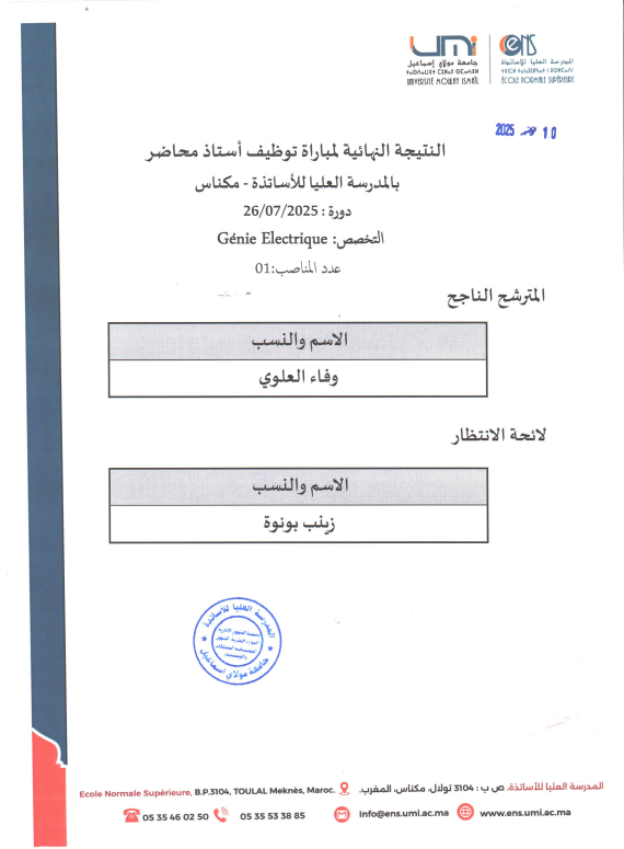 النتيجة النهائية لمباريات توظيف أستاذ محاضر الدرجة أ ، دورة 2025/07/26 ، في التخصصات الآتية 1- العلوم الاجتماعية 2- Français -Linguistique Générale