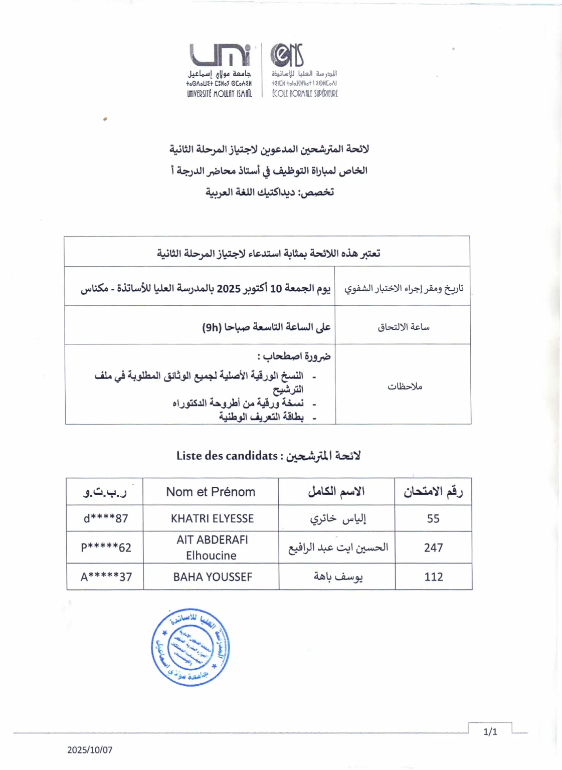 لائحة المترشحين المدعوين لاجتياز المرحلة الثانية الخاصة بمباراة توظيف أستاذ محاضر الدرجة أ ، تخصص : ديداكتيك اللغة العربية