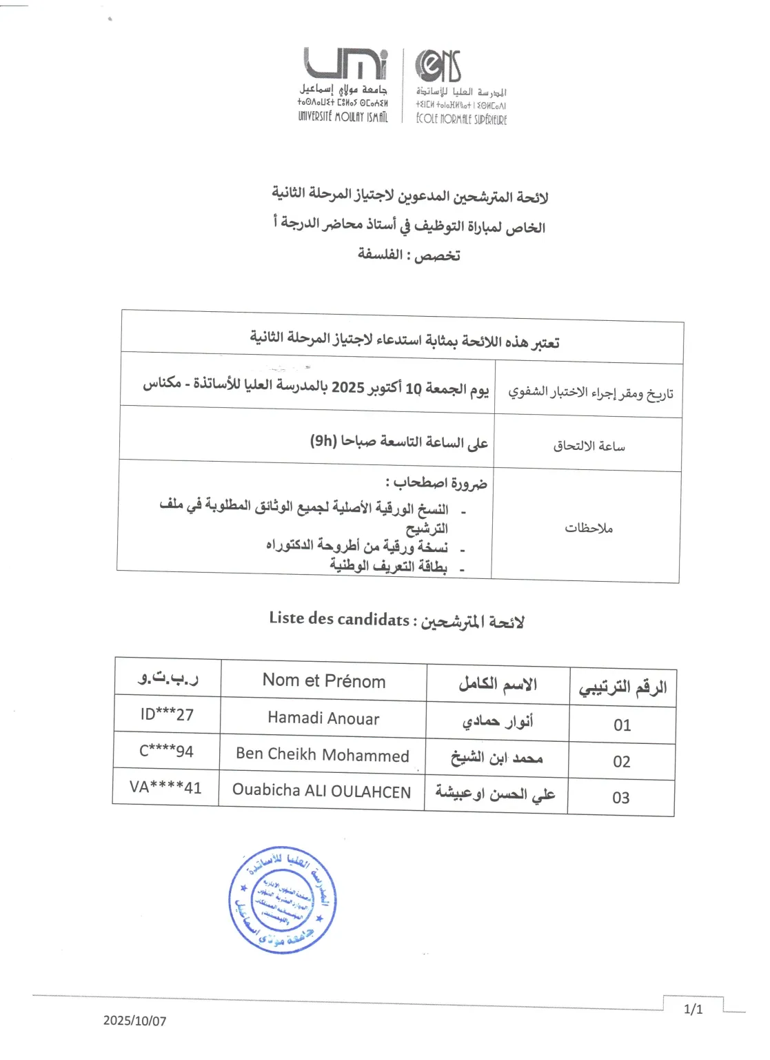 لائحة المترشحين المدعوين لاجتياز المرحلة الثانية الخاصة بمباراة توظيف أستاذ محاضر الدرجة أ ، تخصص : الفلسفة