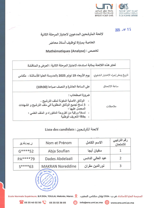 لائحة المترشحين المدعوين لاجتياز المرحلة الثانية الخاص لمباراة توظيف أستاذ محاضر